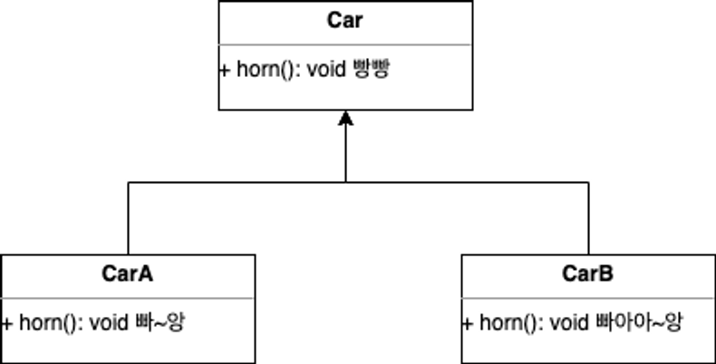 - Car 클래스를 토대로 자동차 객체를 만들 때 A자동차 객체와 B자동차 객체의 경적 소리가 다르다면 ‘경적을 울리다’라는 행위 즉, horn(); 메서드의 구현을 다르게 재정의 하여 사용할 수 있습니다.