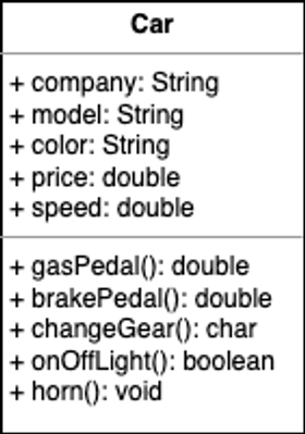 - 현실세계의 여러 종류의 자동차들이 공통적으로 가지고 있는 가속, 브레이크, 속도와 같은 것들을 모아 자동차라는 객체를 모델링 할 수 있습니다.